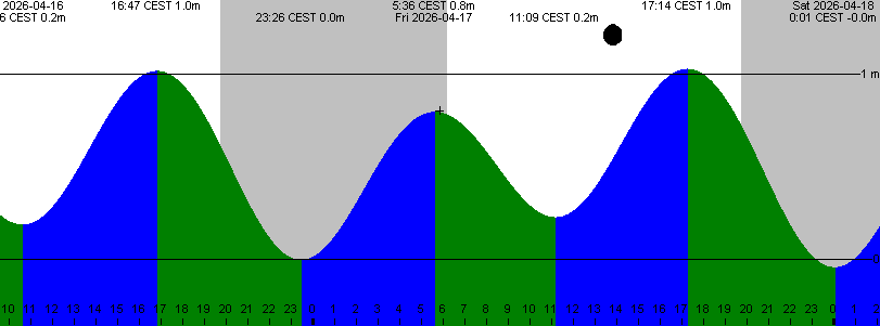 Local Tide predictions Sibenik Venezia, Italy + Corrections: High(-6:12) Low(-6:12) Units are meters, initial timezone is CEST Wednesday Wed 04-15 Sunrise 0614, Sunset 1939 Moonrise 0503, Moonset 1729 High Tide: 0418 0.8 Low Tide: 1002 0.2 High Tide: 1623 1.0 Low Tide: 2253 0.1 Thursday Thu 04-16 Sunrise 0612, Sunset 1941 Moonrise 0524, Moonset 1845 High Tide: 0457 0.8 Low Tide: 1036 0.2 High Tide: 1647 1.0 Low Tide: 2326 0.0 Friday Fri 04-17 New Moon Sunrise 0610, Sunset 1942 Moonrise 0547, Moonset 2005 High Tide: 0536 0.8 Low Tide: 1109 0.2 High Tide: 1714 1.0 Saturday Sat 04-18 Sunrise 0609, Sunset 1943 Moonrise 0614, Moonset 2128 Low Tide: 0001 -0.0 High Tide: 0617 0.8 Low Tide: 1142 0.3 High Tide: 1742 1.0 Sunday Sun 04-19 Sunrise 0607, Sunset 1944 Moonrise 0648, Moonset 2251 Low Tide: 0039 -0.0 High Tide: 0703 0.8 Low Tide: 1217 0.4 High Tide: 1810 1.0 Monday Mon 04-20 Sunrise 0605, Sunset 1946 Moonrise 0731, Moonset 0009 Low Tide: 0120 -0.0 High Tide: 0756 0.7 Low Tide: 1253 0.5 High Tide: 1840 0.9 Tuesday Tue 04-21 Sunrise 0604, Sunset 1947 Moonset 0009, Moonrise 0827 Low Tide: 0207 0.0 High Tide: 0909 0.7 Low Tide: 1338 0.5 High Tide: 1911 0.8 Wednesday Wed 04-22 Sunrise 0602, Sunset 1948 Moonset 0114, Moonrise 0935 Low Tide: 0302 0.1 High Tide: 1109 0.7 Low Tide: 1455 0.6 High Tide: 1942 0.7 Thursday Thu 04-23 Sunrise 0601, Sunset 1949 Moonset 0205, Moonrise 1051 Low Tide: 0414 0.2 High Tide: 1309 0.7 Low Tide: 1814 0.6 High Tide: 2020 0.6 Friday Fri 04-24 Full Moon Sunrise 0559, Sunset 1950 Moonset 0244, Moonrise 1208 Low Tide: 0542 0.2 High Tide: 1402 0.8 Low Tide: 2032 0.5 Saturday Sat 04-25 Sunrise 0557, Sunset 1951 Moonset 0313, Moonrise 1323 High Tide: 0030 0.6 Low Tide: 0701 0.2 High Tide: 1437 0.8 Low Tide: 2104 0.4 Sunday Sun 04-26 Sunrise 0556, Sunset 1953 Moonset 0336, Moonrise 1434 High Tide: 0216 0.6 Low Tide: 0800 0.2 High Tide: 1506 0.9 Low Tide: 2133 0.3 Monday Mon 04-27 Sunrise 0554, Sunset 1954 Moonset 0356, Moonrise 1543 High Tide: 0315 0.6 Low Tide: 0845 0.2 High Tide: 1531 0.9 Low Tide: 2202 0.2 Tuesday Tue 04-28 Sunrise 0553, Sunset 1955 Moonset 0415, Moonrise 1650 High Tide: 0400 0.7 Low Tide: 0921 0.3 High Tide: 1554 0.9 Low Tide: 2229 0.1 Wednesday Wed 04-29 Sunrise 0551, Sunset 1956 Moonset 0433, Moonrise 1756 High Tide: 0438 0.7 Low Tide: 0953 0.3 High Tide: 1614 1.0 Low Tide: 2255 0.1 Thursday Thu 04-30 Sunrise 0550, Sunset 1957 Moonset 0452, Moonrise 1902 High Tide: 0512 0.7 Low Tide: 1021 0.3 High Tide: 1633 1.0 Low Tide: 2322 0.1 Friday Fri 05-01 Full Moon Sunrise 0549, Sunset 1959 Moonset 0513, Moonrise 2008 High Tide: 0544 0.7 Low Tide: 1048 0.4 High Tide: 1652 1.0 Low Tide: 2350 0.0 Saturday Sat 05-02 Sunrise 0547, Sunset 2000 Moonset 0538, Moonrise 2115 High Tide: 0615 0.7 Low Tide: 1114 0.4 High Tide: 1712 1.0 Sunday Sun 05-03 Sunrise 0546, Sunset 2001 Moonset 0607, Moonrise 2219 Low Tide: 0018 0.0 High Tide: 0648 0.7 Low Tide: 1141 0.4 High Tide: 1732 0.9 Monday Mon 05-04 Sunrise 0544, Sunset 2002 Moonset 0645, Moonrise 2318 Low Tide: 0048 0.0 High Tide: 0724 0.7 Low Tide: 1208 0.5 High Tide: 1754 0.9 Tuesday Tue 05-05 Sunrise 0543, Sunset 2003 Moonset 0730, Moonrise 0010 Low Tide: 0119 0.1 High Tide: 0808 0.7 Low Tide: 1239 0.5 High Tide: 1817 0.8